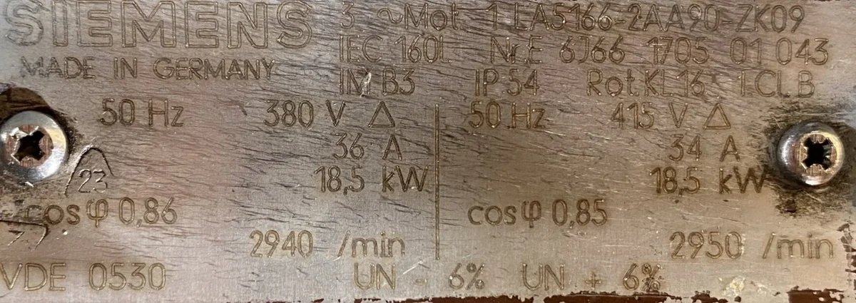 Prezentowany silnik elektryczny trójfazowy marki Siemens o mocy 18,5 kW to doskonałe rozwiązanie dla wymagających zastosowań przemysłowych. Urządzenie pracuje z prędkością obrotową wynoszącą 2940 obr/min, co czyni je idealnym wyborem do napędu maszyn wymagających wysokiej dynamiki i stabilności pracy. Silnik pochodzi od jednego z najbardziej renomowanych producentów na świecie – firmy Siemens, której produkty od dekad wyznaczają standardy jakości w branży elektrycznej i automatyki przemysłowej.