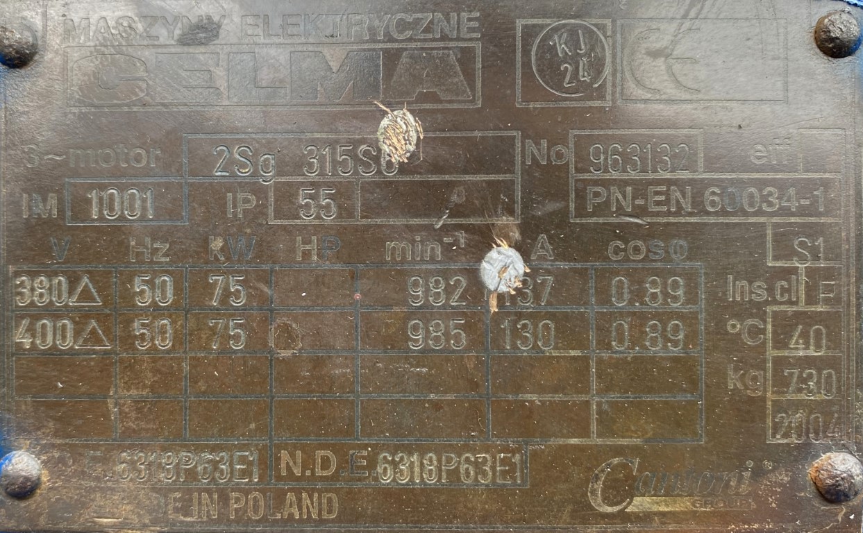 Kluczowe parametry techniczne obejmują moc 75 kW oraz prędkość obrotową 985 obr/min. Silnik został wyposażony w wał o średnicy 80 mm oraz posiada wielkość mechaniczną 315. Jego całkowita masa wynosi 730 kg, co świadczy o wytrzymałej i stabilnej konstrukcji.